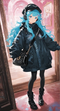 The background is white, the cool and cool girl in the second dimension, fashionable theme, extremely imaginative, rich association, watercolor fusion ink, very design-oriented clothing, character design, super details, and layering. Complex, American. The lady is glossy and lines. Golden big wave white Chanel bag. Black little scent windbreaker clothes. Little Xiangfeng small top hat. Long boots. The sense of atmosphere and layering combines Monet oil painting style and anime watercolor style, and uses clear strokes and soft light to show rich and bright colors. The hair of the character in the center of the picture heavily covers the face, messy hair, and thick coating techniques and streamlined brushes are used to create hazy, full composition, delicate details, and long hair creates a picture full of story atmosphere. The picture is mainly colored by blue and pink, making the picture full of grainy, natural, blurred sense, background interior, facial expression, top composition, weird aesthetics, whole body, hairpin, stickers, dopamine, princess cut, cyberpunk style, middle 2, headphones