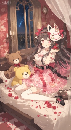 Anime style, a beautiful girl with long dark hair with pink highlights, wearing a white fox mask decorated with red patterns and flowers on her head, with pink eyes and a gentle smile. She wore a white short-sleeved shirt, a pink skirt with decorative belt (with knot details), paired with white over-knee stockings, and pink thick-soled Mary Jane shoes decorated with red bows and small flowers. She was sitting on a bed covered with white bedding, next to her a brown teddy bear with a red bow tied with a small bell. The background shows the night cityscape through the windows, as well as starry sky and shooting stars. The interior is light soft and framed floral paintings are hung on the wall. The image has rich details, bright colors and clear focus, which is a masterpiece.