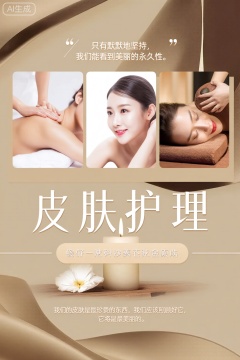 该图像具有护肤服务的促销广告。在顶部,有一个短语写着:“只有默默地坚持,我们能看到美丽的永久性。”在此下方,有三张图像显示了护肤服务的不同方面:一个在肩膀上接受按摩的人,一个微笑的女人的特写,另一个人躺在带有圆形按摩工具的按摩桌上。图像的中心部分突出显示了大型,白色和风格化字体的文本“皮肤护理”。在此下方,有一个装饰性元素,上面有一朵白花和一支在米色背景的蜡烛。底部的文字上写着:“我们的皮肤是最珍贵的东西,我们应该照顾好它,它将是最美丽的。”总体设计优雅,专注于促进豪华和宁静的护肤体验。
