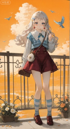 The super Q version of the girl is a delicate and delicate ornament with a head-to-body ratio of 1:1.2, showing a stance of standing firmly with her feet and looking down at the bear beside her. Her hair is a fluffy Pisces braid. Her hair is light and has a clear texture. Her texture is as delicate as gentle linen, with a warm texture and layering. It is a flexible and natural soft ceramic resin texture, which fits the retro childlike theme with a fluffy three-dimensional style. The fine bangs on the forehead are naturally scattered. The braid is decorated with colorful clips and flower rubber bands, showing the innocent and retro temperament; the makeup on the face is centered on the retro childlike fun, with curved and slender eyebrows, and the eyeshadow is light brown and light pink gradient. Smudge, blush is selected as a vital orange pink, with fine freckle texture, clear and droopy eyes, with natural fiber-slim eyelashes, light brown gradient edges, second-dimensional hand-painted gradients in the eye pupil, with bright white highlights, and a light purse-slim curves; the clothing is a light retro plaid short jacket, paired with striped socks and plaid shoes, the main color is brown plaid and blue, auxiliary color colorful cloth patches, bright color decorative buckle metallic luster, the pattern is a simple cloth patch shape, the material is real, the neck mini mutt hanging decoration, the ear flower earrings; the base is a mini fence, strange tree twigs (pering small dolls, birds, and small decorations for hanging apples ), the warm orange background changes the sky, and the soft light forms light and darkness in the fluffy hair and the folds of the clothing, presenting a full-body shape. The striped socks and plaid shoes on the lower body are decorated clearly and coherently echo. The Q-version ornaments present a unique atmosphere of retro, innocent and fantasy.
