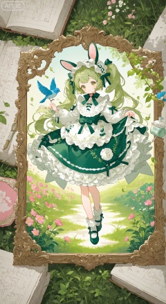 Fantasy illustration, dark green rectangular bottom, rabbit ear Lolita girl with interactive bird, surrounded by layered pink flowers and translucent green leaves, cream powder white main color embellishment grass green crimson, flat cute shape, picture book paper texture