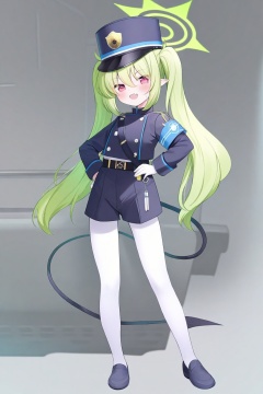 blue archive, nozomi \(blue archive\), 1girl, armband, black tail, blue armband, buttons, demon tail, double-breasted, fang, full body, green hair, green halo, halo, hand on own hip, hat, long hair, looking at viewer, pantyhose, peaked cap, pointy ears, shorts, skin fang, smile, solo, tail, train conductor, twintails, white background, white pantyhose<lora:ch_p-000021:1>