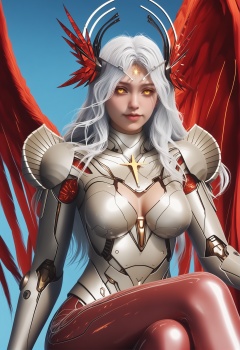 score_9,score_8_up,score_7_up,1girl,solo,realistic,(looking at viewer:1.1),1girl,solo,realistic,bodysuit,breastplate,armor,shoulder armor,boobplate,red wings,wings,mechanical wings,feathered wings,angel wings,1girl,solo,realistic,circlet,tiara,mechanical halo,halo,hair ornament,head wings,headpiece,1girl,solo,realistic,(mature face:1.2),big eye,(pale_skin:1.1),shiny_skin,slender face,long hair,grey hair,white hair,forehead mark,facial mark,glowing eyes,yellow eyes,colored sclera,eyelashes,nose,lips,closed mouth,long legs,realistic,red_theme,solid background,simple background,sitting,crossed_legs,(white chair:0.8),(magazine cover theme:0.75),medium breasts,(cleavage:1.1),cleavage cutout,<lora:小巳-星幻王:0.85>,
