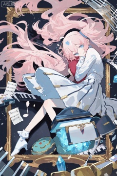 Dreamy watercolor style, soft smudged brushstrokes, sweet elements, copyright description frame, girl's body, light pink curly hair (the ends are curled, hanging from the gap of the half-open box lid, wrapping around the wheel of the box), creamy white satin skirt (the hem is fluffy, squeezed on the velvet in the box, the corners of the skirt are embossed with piano keys, and the neckline Swarovski crystal flashes with the action), gauze sleeve (the note track at the sleeve edge, one sleeve slides down, floating next to the cloud cushion in the box), fragile and gorgeous temperament, looking outward, you can see the girl being trapped in the transparent edge crystal music box, (the side length is 50cm, the lid is half open, with velvet bottom, mini piano, cloud cushion, rotating gear), knees against the inner wall of the box, back is attached to the bottom of the box, arms are crossed to the chest, eyes are confused looking out (through the gap of the half-open box lid ), matched with love and musical notes decorative stickers
