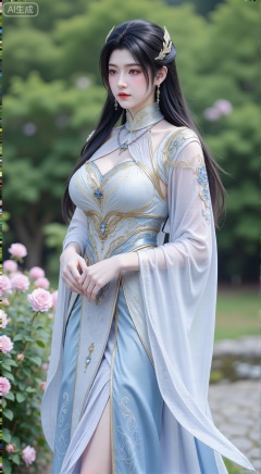 (masterpiece:1.2),best quality,,A woman adorned in traditional Chinese attire,(long dress,black long hair),featuring a flowing robe with intricate embroidery and floral accents. A garden filled with pink roses and lush greenery. Soft pastel hues of white,blue,and green,creating a serene atmosphere. Photorealistic photography.,(huge breasts:2.99),(full breasts:2.99),,XbaifengsongyuYH,Xbigbreasts,Xyehuiling,XtangwutongXnb