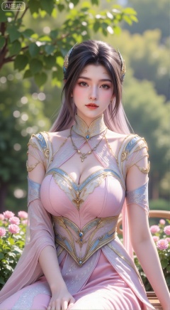 (masterpiece, best quality:1.2),A beauty ,(dress). Leaning on a garden bench filled with macaron - colored flowers,.Sunlight filters through the leaves onto her face, creating a lazy and gentle atmosphere, and her skirt sways softly in the breeze. 8K resolution, detailed texture of knitted fabric, lustrous pearl texture, vivid flower colors, soft natural light, Instagram - style filter texture.,(huge breasts:2.99),(full breasts:2.99),,XbaifengsongyuYH,Xbigbreasts,Xyehuiling,XtangwutongXnb