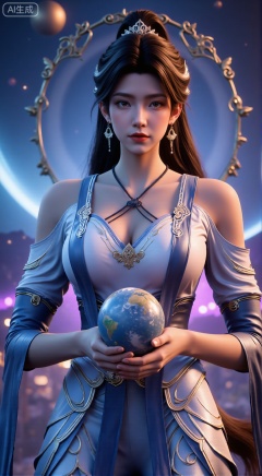 (masterpiece, best quality:1.2),Realistic details, ultra-clear, wallpaper, 8k, masterpiece, masterpiece, best quality, high quality, flowing long hair, exquisite hair accessories, headdresses, cyberpunk electronic luminous clothing, full body multi-luminous line light strips, cyberpunk luminous lines colorful. The sacred light, the cosmic space background, the planets of different colors around, the nebula flows, the stars twinkle, the golden willow branches stretch, holding an earth with both hands, the details of the earth's surface, the texture of mountains, rivers and oceans, the surrounding planets, planets of all sizes, traces of planets orbits, dreamy light and shadow effects.,(huge breasts:2.99),(full breasts:2.99),XbaifengsongyuYH,Xbigbreasts,Xyehuiling,XtangwutongXnb