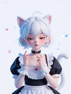 1girl, solo, breasts, looking at viewer, blush, short hair, bangs, simple background, red eyes, white background, dress, animal ears, medium breasts, closed mouth, collarbone, tail, upper body, ahoge, white hair, short sleeves, heart, frills, choker, puffy sleeves, cat ears, hair over one eye, apron, black dress, puffy short sleeves, cat tail, parted bangs, wrist cuffs, maid, hands up, eyes visible through hair, waist apron, white apron, frilled apron, frilled choker ,backlighting,blue and white theme,depth of field,cinematic lighting,light particles,lens flare, extreme aesthetic,(wlop:1.0),masterpiece,best quality,good quality,newest,very aesthetic,absurdres,A shot with tension, 32K UHD,sharp focus,best-quality,masterpiece,Emotionalization,temperate atmosphere,with a high-end texture,in the style of fashion photography, (Visual impact:1.2),impactful picture,offcial art,colorful,movie perspective, masterpiece