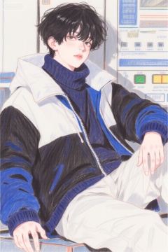 该图像描绘了一个年轻的人,黑发短而醒目。他们穿着一件分层的服装,包括深蓝色高领毛衣和白色和蓝色外套。该人坐在坐在他们的腿上。在背景中,有一个控制面板,上面有各种按钮和指标,暗示了未来派或技术环境。面板上的文字包括“