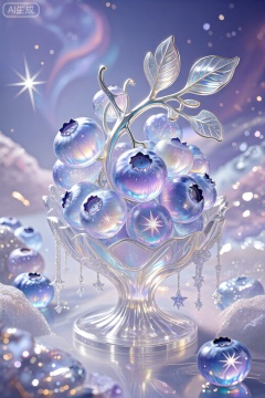星云状的幻银琉璃蓝莓,靛紫、银白的星芒在蓝莓果粒里穿梭,铂银像星尘凝结,珐琅果枝带着星轨纹路,缠在闪着星辉的透明支架上(支架垂着琉璃星屑),周围浮着琉璃星雾,背景是深邃的靛紫色柔光。