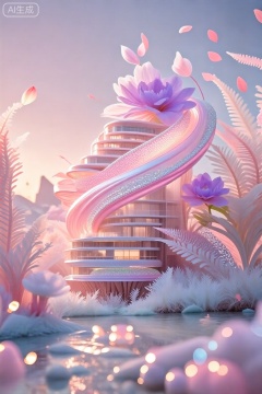 樱粉晨曦里,螺旋状的流线建筑被大朵紫阳花与粉白蕨类环绕,建筑边缘镶嵌着渐变的珠光纹路,周围飞舞着花瓣状的发光孢子,浅滩水面倒映着建筑轮廓,呈现出柔和的梦幻氛围。