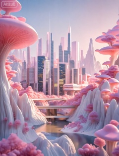现代都市与奇幻自然的结合体,城市中有高耸的摩天大楼,建筑表面呈现出玻璃的质感,城市周围环绕着粉色的蘑菇状树木和白色的山峦,山脚下有一条河流,河面上有一座连接两岸的桥梁,整体画面展现了一个超现实的未来世界,