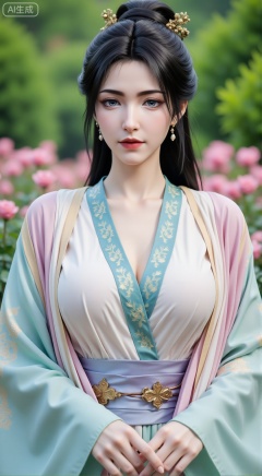 (masterpiece:1.2),best quality,,A woman adorned in traditional Chinese attire,(long dress,black long hair),featuring a flowing robe with intricate embroidery and floral accents. A garden filled with pink roses and lush greenery. Soft pastel hues of white,blue,and green,creating a serene atmosphere. Photorealistic photography.,(huge breasts:2.99),(full breasts:2.99),,XbaifengsongyuYH,Xbigbreasts,Xyehuiling,XtangwutongXnb,Xyinyangjiaoshengnv,XmupeilingHongyi