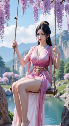 sfw,(masterpiece, top quality, best quality, official art, beautiful and aesthetic:1.2),Dynamic posture,(Sitting on the swing:1.39),natural skin texture,(Milky skin:1.2),1gir,solo,long Dress, (Long legs, perfect proportions:1.2),(Sakura, butterfly:1.29),(huge breasts:2.99),(full breasts:2.99),Wisteria, wisteria flowers, castle, waterfall, mountains in the distance,,XbaifengsongyuYH,Xbigbreasts,Xyehuiling,XtangwutongXnb,Xyinyangjiaoshengnv,XmupeilingHongyi