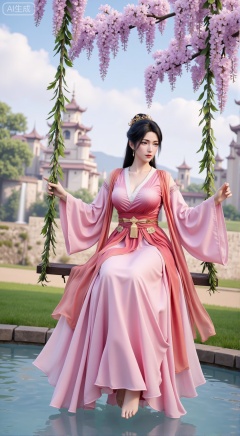 sfw,(masterpiece, top quality, best quality, official art, beautiful and aesthetic:1.2),Dynamic posture,(Sitting on the swing:1.39),natural skin texture,(Milky skin:1.2),1gir,solo,long Dress, (Long legs, perfect proportions:1.2),(Sakura, butterfly:1.29),(huge breasts:2.99),(full breasts:2.99),Wisteria, wisteria flowers, castle, waterfall, mountains in the distance,,XbaifengsongyuYH,Xbigbreasts,Xyehuiling,XtangwutongXnb,Xyinyangjiaoshengnv,XmupeilingHongyi