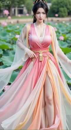 (masterpiece, best quality:1.2),1girl, navel, solo, midriff, bare shoulders, hair ornament,(long hair),(High double ponytail:1.49), red lips, BREAK, (looking at viewer:1.39), chinese clothes,(Holographic pink|white|yellow long dress:1.36), (lace,Rainbow Gradient Color:1.28), BREAK,blurry, solo focus, long hair, lips, daytime, lipstick, outdoors, standing,upper body,(huge breasts:2.89), background, solo, makeup,(Stockings, high heels:1.29),(huge breasts:2.99),(full breasts:2.99),,(Background with lotus pond and pink lotus flowers:1.39),XbaifengsongyuYH,Xbigbreasts,Xyehuiling,XtangwutongXnb,Xyinyangjiaoshengnv,XmupeilingHongyi