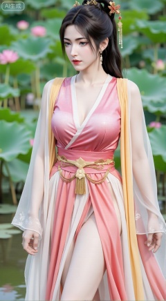 (masterpiece, best quality:1.2),1girl, navel, solo, midriff, bare shoulders, hair ornament,(long hair),(High double ponytail:1.49), red lips, BREAK, (looking at viewer:1.39), chinese clothes,(Holographic pink|white|yellow long dress:1.36), (lace,Rainbow Gradient Color:1.28), BREAK,blurry, solo focus, long hair, lips, daytime, lipstick, outdoors, standing,upper body,(huge breasts:2.89), background, solo, makeup,(Stockings, high heels:1.29),(huge breasts:2.99),(full breasts:2.99),,(Background with lotus pond and pink lotus flowers:1.39),XbaifengsongyuYH,Xbigbreasts,Xyehuiling,XtangwutongXnb,Xyinyangjiaoshengnv,XmupeilingHongyi