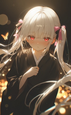 masterpiece,absurdres,best quality,high quality,chromatic_aberration,Night,darkness,black theme,shy,embarrass,endured_face,nsfw,//,artist:konya_karasue,//,loli,konya,1girl,solo,long hair,looking at viewer,blush,bangs,red eyes,long sleeves,bow,twintails,very long hair,upper body,white hair,hair bow,parted lips,japanese clothes,kimono,blurry,:o,black dress,black bow,floating hair,depth of field,animal,bug,pink bow,butterfly,black kimono,//,//,highres,HDR,8K,high contrast,illustration,depth of field,(colorful),Tyndall effect,contrast,lens flare,