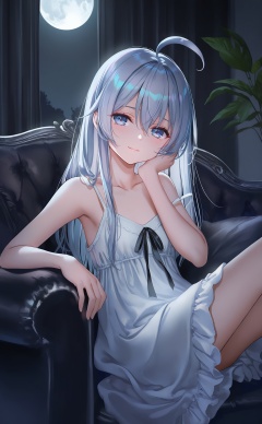 masterpiece,absurdres,best quality,high quality,chromatic_aberration,Night,darkness,black theme,shy,embarrass,endured_face,nsfw,//,1girl, solo, ahoge, elaina (majo no tabitabi), long hair, looking at viewer, sitting, smile, grey hair, indoors, grey eyes, couch, white dress, dress, window, blush, moon, collarbone, black ribbon, closed mouth, strap slip, curtains, nightgown, blue eyes, night, head rest, full moon, half-closed eyes, hair between eyes, arm rest, bare shoulders, moonlight, blurry, on couch, spaghetti strap, white camisole, camisole, ribbon, blue hair, off shoulder, sleepwear, sleeveless, white hair, straight hair, plant, sundress, bare arms, light smile, head tilt, blurry foreground//,gawako,atdan,machi_(machi0910),torino_aqua,izumi_tsubasu,[as109],ke-ta,sho_(sho_lwlw),rhasta,tidsean,chiaroscuro,wlop,toosaka_asagi,nixeu,[chen_bin],jima,//,highres,HDR,8K,high contrast,illustration,depth of field,(colorful),Tyndall effect,contrast,lens flare,