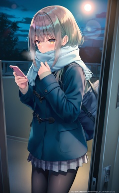 masterpiece,absurdres,best quality,high quality,chromatic_aberration,Night,darkness,black theme,shy,embarrass,endured_face,nsfw,//,1girl, solo, scarf, pantyhose, skirt, holding, bag, black pantyhose, school bag, long hair, pleated skirt, coat, yellow eyes, phone, enpera, blue coat, holding phone, long sleeves, grey skirt, sunset, school uniform, sweater, open door, blue scarf, plaid skirt, standing, cloud, plaid, blue bag, tree, door, cellphone, copyright notice, sky, sidelocks, smartphone, covered mouth, buttons, outdoors, green hair, winter clothes, sun, blush, grey hair, white scarf, indoors, jacket, fringe trim, duffel coat, from side, shoulder bag//,hotorealistic,((Artist:na-ga)),artist:luvluvvox,artist:fukai ryosuke,[artist:Torino aqua],artist:minato hitori,hiten_(hitenkei),artist:rurudo,artist:lazuri7,artist:yunikon,artist:ramchi,(courreges_ace),//,highres,HDR,8K,high contrast,illustration,depth of field,(colorful),Tyndall effect,contrast,lens flare,