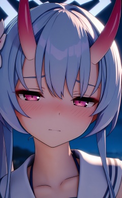 masterpiece,absurdres,best quality,(high quality:0.9),chromatic_aberration,Night,darkness,black theme,shy,embarrass,endured_face,nsfw,//,mmd style,1girl, solo, horns, blurry, looking_at_viewer, halo, depth_of_field, blue_hair, sidelocks, hair_ornament, long_hair, swimsuit, blurry_background, hair_flower, oni, bikini, collarbone, hair_between_eyes, purple_eyes, blush, half-closed_eyes, sailor_collar, white_sailor_collar, flower, closed_mouth, portrait, sleeveless, red_horns, close-up, pink_eyes, pink_horns, side_ponytail, upper_body, striped_bikini, red_eyes//,highres,HDR,8K,high contrast,illustration,depth of field,(colorful),Tyndall effect,contrast,lens flare,