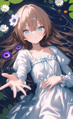 masterpiece,absurdres,best quality,(high quality:0.9),chromatic_aberration,Night,darkness,black theme,shy,embarrass,endured_face,//,1girl,flower,dress,solo,white dress,anemone (flower),white flower,long hair,hair flower,water,hair ornament,long sleeves,looking at viewer,lily pad,parted lips,afloat,reaching,partially submerged,reaching towards viewer,traditional media,frills,painting (medium),puffy sleeves,on back,hair spread out,lying,wavy hair,collarbone,light brown hair,juliet sleeves,blue eyes,holding flower,watercolor (medium),brown hair,blue flower,frilled dress,purple flower,orange flower,frilled sleeves,hair between eyes,outstretched hand,floral print,outstretched arm,daisy,signature,holding,from above,artist name,lying on water,hand on own stomach,ripples,//,rurudo,(ningen_mame:0.9),(nanananana:0.6),(reoen:0.7),rin_yuu,(ningen_mame:0.8),(wlop:0.7),(sy4:0.5),(ciloranko:0.2),(chocoan:0.8),//,highres,HDR,8K,high contrast,illustration,depth of field,(colorful),Tyndall effect,contrast,lens flare,