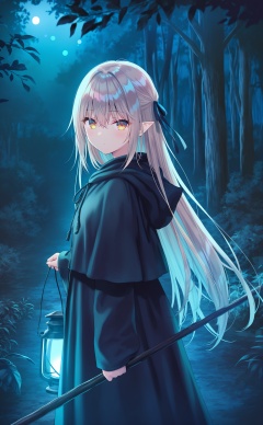 masterpiece,absurdres,best quality,high quality,chromatic_aberration,Night,darkness,black theme,shy,embarrass,endured_face,nsfw,//,1girl,holding lantern,holding,forest,solo,nature,long hair,lantern,pointy ears,staff,hood,holding staff,yellow eyes,hood down,looking at viewer,white hair,elf,robe,very long hair,outdoors,long sleeves,standing,plant,expressionless,tree,hair ribbon,from side,ribbon,night,hair ornament,capelet,leaf,blue theme,closed mouth,blue dress,hooded coat,hooded cloak,dress,looking to the side,sidelocks,cloak,hooded capelet,sleeves past wrists,black robe,blue robe,feet out of frame,hooded robe,grey hair,hair between eyes,//,potorealistic,((Artist:na-ga)),artist:luvluvvox,artist:fukai ryosuke,[artist:Torino aqua],artist:minato hitori,hiten_(hitenkei),artist:rurudo,artist:lazuri7,artist:yunikon,artist:ramchi,(courreges_ace),//,highres,HDR,8K,high contrast,illustration,depth of field,(colorful),Tyndall effect,contrast,lens flare,