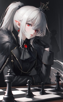 masterpiece,absurdres,best quality,(high quality:0.9),chromatic_aberration,Night,darkness,black theme,shy,embarrass,endured_face,//,chess piece, chessboard, 1girl, black gloves, gloves, solo, chess, crown, red eyes, long hair, white hair, pointy ears, board game, sitting, long sleeves, pawn (chess), black jacket, jewelry, king (chess), looking at viewer, hand on own face, black ascot, jacket, head rest, closed mouth, black shirt, slit pupils, ear piercing, upper body, ascot, shirt, knight (chess), queen (chess), piercing, fur trim, chair, hand on own cheek, rook (chess), collared shirt, on chair, expressionless, brooch, hair between eyes, red gemstone, ponytail, earrings, sidelocks, mini crown, blurry, vampire, parted lips, throne, pale skin, very long hair//,(monochrome:1.2),(silhouette:1.2),oil painting \(medium\),brushstroke,taitai,(maccha (mochancc):0.6),(suzumi (ccroquette):0.7),(wlop:0.6),(reoen:0.6),(tianliang duohe fangdongye:0.7),(rhasta:0.6),very awa,very aesthetic,extreme aesthetic,//,highres,HDR,8K,high contrast,illustration,depth of field,(colorful),Tyndall effect,contrast,lens flare,