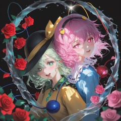 masterpiece,absurdres,best quality,high quality,chromatic_aberration,black_background,//,flower,komeiji koishi,2girls,rose,multiple girls,thorns,hat,siblings,sisters,komeiji satori,back-to-back,blue shirt,diamond button,red flower,red rose,shirt,pink hair,open mouth,frilled shirt collar,yellow shirt,frills,heart button,hair ornament,heart,smile,black headwear,short hair,hair over one eye,green hair,heart hair ornament,buttons,teeth,looking at viewer,vines,:d,glowing,hat ribbon,ribbon,red eyes,yellow ribbon,upper body,black background,upper teeth only,parted lips,third eye,plant,collared shirt,one eye covered,bright pupils,water drop,blood,glowing eyes,long sleeves,floating hair,hairband,hair flower,white pupils,medium hair,blue eyes,hair between eyes,green eyes,liquid,blouse,pink eyes,glowing eye,crystal,hat bow,symbol-shaped pupils,eyebrows hidden by hair,heart of string,water,leaf,blush,pink rose,eyelashes,frilled sleeves,heart-shaped pupils,bow,pink flower,black hairband,//,(monochrome:1.2),(silhouette:1.2),oil painting \(medium\),brushstroke,taitai,(maccha (mochancc):0.6),(suzumi (ccroquette):0.7),(wlop:0.6),(reoen:0.6),(tianliang duohe fangdongye:0.7),(rhasta:0.6),very awa,very aesthetic,extreme aesthetic,//,highres,HDR,8K,high contrast,illustration,depth of field,(colorful),Tyndall effect,contrast,lens flare,<lora:nyalia22——【noob】hans:0.5>,back-to-back,