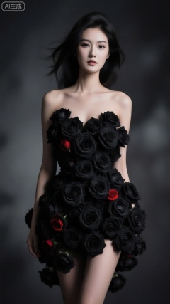 一位身材曼妙的女性,全身以黑色玫瑰精心装饰,整体呈现暗黑风格,神秘且魅惑。光线方面,以低调的侧逆光为主,勾勒出女性身体的线条与花朵的轮廓,让阴影部分更加深邃,营造神秘氛围。渲染细腻逼真,宛如真实场景拍摄。色彩以黑、灰为主色调,黑色玫瑰与女性的深色服饰相呼应,偶尔点缀几抹暗红色,增强视觉冲击力。构图采用中心构图,将女性置于画面中心,突出主体。视角选择平视角度,给人一种近距离接触的真实感。摄影参数上,大光圈以虚化背景,突出人物主体,慢快门捕捉可能的细微动态,感光度适中,保证画面清晰且噪点少。