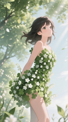 一位身姿灵动的二次元少女,身上被着铃兰、苜蓿等小巧花朵装饰着,充满清新梦幻的二次元风格。光线如同透过茂密树叶间隙的斑驳光线,营造出自然而奇幻的氛围。渲染以二次元赛璐璐风格为主,色彩鲜明且过渡自然。构图上运用三分法,将少女置于画面右侧黄金分割点。视角为斜侧方仰拍,展现少女俏皮可爱。摄影参数上,快门速度适中,定格美好瞬间,焦距稍长,突出主体细节。,细腻刻画