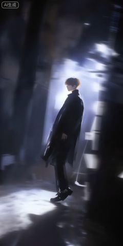 a photo-realistic shoot from a profile camera angle about a man standing in a dimly lit environment, silhouetted against a blurred background, the image also shows a man in the middle of the frame, who appears to be in his early twenties, with short brown hair and a serious expression, he is wearing a long black coat and black shoes, and is standing on a tiptoes, the man is facing away from the viewer, and his body is positioned in a way that creates a sense of depth and perspective, the lighting is dramatic, with a mix of blue and white hues, creating a moody atmosphere, the background is blurred, with motion lines and abstract shapes, adding to the sense of movement and depth, the overall effect is one of a mysterious and contemplative scene, with the man standing alone in the center of the image,