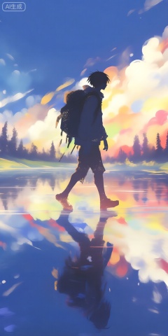 a digital illustration shoot from the side about a silhouette of a person walking across a reflective surface, surrounded by a vibrant, colorful cloud-like landscape, the image also shows a serene, calm lake with reflections of trees and mountains in the water, on the middle of the image, a single person, who appears to be a young *****, is walking away from the viewer, with their full body visible, the person is wearing no clothing, pants, shoes, or accessory, and is carrying a large backpack, they are facing away, and their body is positioned in a way that creates a sense of depth and perspective, the sky is a deep blue, with a few clouds scattered across it, and the trees are silhouetted against it, adding to the serene atmosphere of the scene, the water is calm and reflects the colors of the sky, creating a beautiful contrast with the persons silhouette,