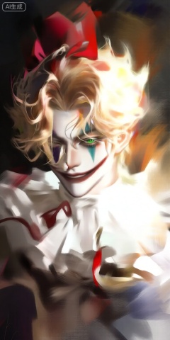 a digital illustration shoot from a portrait camera angle about a stylized character with a unique and colorful appearance, featuring a joker-like appearance, the image also shows a solo male character, who appears to be in the middle of the frame, with a confident and slightly mischievous expression, wearing a white outfit with a red bow on his head and a red ribbon around his neck, the character has short, wavy, blonde hair that is styled in a way that frames his face, and his eyes are a striking green color, he has a sinister smile and is looking directly at the viewer, the background is a dark, abstract mix of dark and light colors, creating a dramatic and moody atmosphere, the style is reminiscent of japanese anime and manga, with bold lines and vibrant colors that bring out the characters striking features,