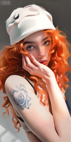 a digital illustration shoot from a portrait camera angle about a young woman with vibrant orange curly hair wearing a white hat and a tattoo on her upper arm, the image also shows a playful and confident expression, on the middle of the image, a 20 years old woman with light skin, who appears to be in her early twenties, is looking directly at the viewer with a playful expression, she has a serene and confident demeanor, with her hand on her face and her hand resting on her cheek, her hair is styled in long, wavy, and her eye color is blue, her body is slim, and she is wearing a black **** top, on her arm, there is a tattoo of a blue rose, the background is a simple gradient of dark grey to white, with soft lighting that highlights the womans features,