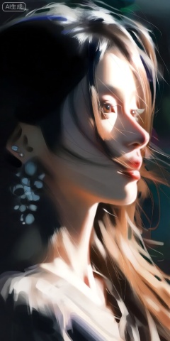 a digital illustration shoot from a profile camera angle about a portrait of a woman with long hair and a hat, adorned with earrings, the image also shows soft lighting and a blurred background, on the middle of the image, a young woman appears to be in her early twenties, with light skin, brown eyes, and long brown hair, she is facing the viewer, looking slightly to the side, with a neutral expression, her hair is styled in loose waves, and she is wearing a black hat and earrings with a flower design, her body is slim and she has a mole under her eye, her lips are parted, and her nose is visible, the lighting is soft and diffused, creating a gentle glow on her face and hair, the background is dark and blurred, adding to the sense of depth and atmosphere,