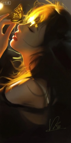 a digital illustration shoot from a profile camera angle about a close-up portrait of a woman with glowing yellow hair and butterflies, set against a dark background, the image also shows a signature in the bottom right corner, on the middle of the image, a young woman appears to be in her early twenties, with her eyes closed and a serene expression, she has long, dark hair and is wearing a black top, her hair is styled in a way that frames her face, and she is looking up towards the sky with a dreamy, ethereal quality, the woman is positioned in the center of the frame, and her upper body is visible, she is holding a small, glowing yellow butterfly near her head, adding a touch of whimsy to the image, the background is blurred, focusing attention on the woman and the butterfly, the lighting is soft and warm, creating a moody atmosphere,