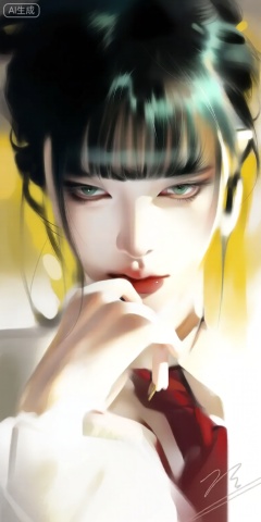 a digital illustration shoot from a portrait camera angle about a close-up portrait of a woman with striking features and a thoughtful expression, featuring a young woman with pale skin and black hair styled in an updo with bangs, looking directly at the viewer with green eyes, she is positioned in the middle of the image, with her upper body visible and her hand resting on her chin, as if deep in thought, the woman has a serious expression and is wearing a white shirt with a red tie, the background is a gradient of yellow and white, creating a soft and dreamy atmosphere, the image also features a signature in the bottom right corner, adding a personal touch to the overall composition,
