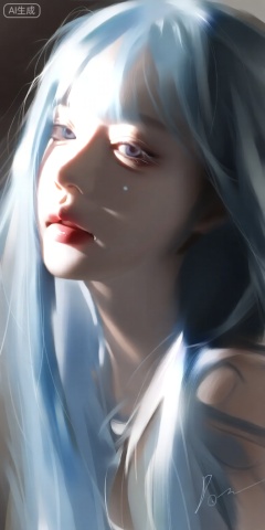 a digital illustration shoot from a portrait camera angle about a close-up portrait of a young woman with long, flowing blue hair, illuminated by soft, diffused light, the image also shows a signature in the bottom right corner, on the middle of the image, a woman appears to be in her early twenties, with light skin, blue eyes, and a serene expression, she is facing the viewer, with her eyes looking directly at the viewer, her hair is styled in long hair, and her hair color is blue hair, she has a nose piercing and red lips, her body is slim, and she is wearing a white top, the lighting is soft and diffused, creating a gentle glow on her face and hair, the background is blurred and dark, with a subtle gradient effect,