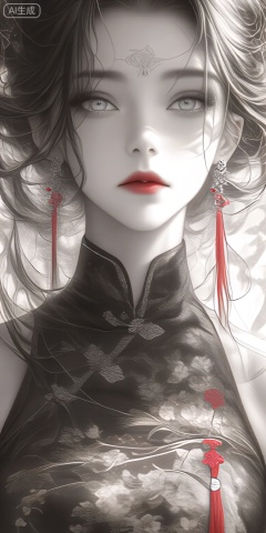 a digital illustration shoot from a portrait camera angle about a portrait of a woman in a traditional chinese outfit with floral patterns and red accents, featuring a young woman with pale skin and long, wavy black hair, wearing a black cheongsam with intricate floral designs and a red sash, adorned with red earrings, the woman, who appears to be in her early twenties, is positioned in the middle of the image, with her upper body facing the viewer and looking directly at them with a serious expression, her eyes are a striking shade of grey, and her eyelashes are painted with red lipstick, her hair is styled in a long, flowing manner, and she has a subtle, intricate design on her forehead, she is wearing a sleeveless, high-necked black dress with a floral pattern, and a pair of earrings that add to her elegant and sophisticated look, the background is a soft, ethereal light, with a blurred, abstract design that adds to the overall sense of depth and dimensionality, the image is in black and white, with the womans face and clothing being the main focus, and the overall effect is one of serenity and elegance,
