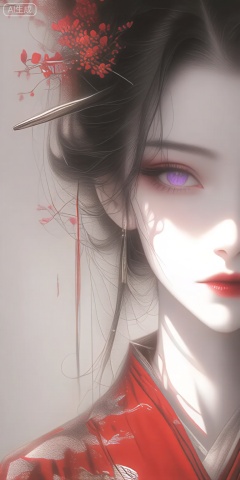 a digital illustration shoot from a close-up camera angle about a portrait of a young woman with striking features, wearing a red kimono and adorned with a red flower in her hair, the image also shows a soft, ethereal light illuminating her face and upper body, on the middle of the image, a 20-year-old woman appears to be looking directly at the viewer with a serene expression, she has pale skin, long black hair styled in a single hairpin with red flowers, and her eyes are a striking purple color, her hair is parted to the side, and she is wearing a traditional japanese outfit with intricate patterns, her lips are painted with red lipstick, adding a touch of elegance to her overall appearance, the background is a simple gradient of light gray, with subtle hints of red and white, creating a soft and dreamy atmosphere,