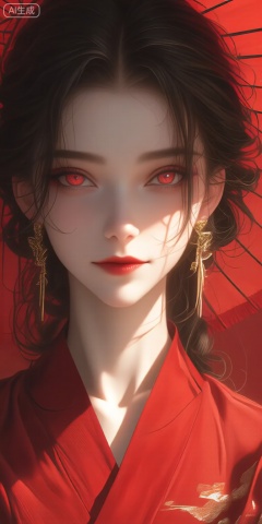 a close-up portrait of a young woman with striking red eyes and dark hair, wearing a traditional red outfit and gold earrings, she is positioned in the middle of the image, with her upper body facing the viewer and her eyes looking directly at the viewer, her hair is styled in a long, wavy manner and falls down her back, framing her face, her lips are painted with red lipstick, and she has a subtle smile on her lips, the background is a bright red umbrella, which casts a shadow on her face, adding to the dramatic effect of the portrait, the lighting is soft and warm, highlighting her features and creating a sense of elegance and sophistication, the overall effect is one of beauty and sophistication, with a focus on the womans elegant and sophisticated appearance,