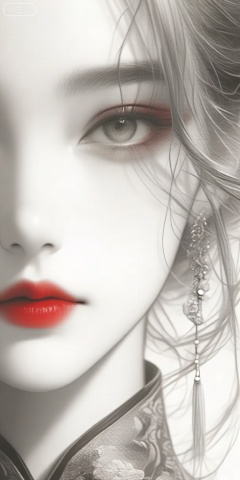 a close-up portrait of a young woman with striking red lipstick and dramatic eye makeup, captured from a portrait camera angle, the subject, a 20-year-old woman with light skin, appears to be looking directly at the viewer with a neutral expression, she has long, wavy, light-colored hair that falls between her eyes, and is wearing a traditional chinese outfit with intricate patterns and a pair of dangling earrings, her lips are painted with bright red lipstick, and her eyebrows are perfectly groomed and filled in, the background is a soft, blurred white, which contrasts with the womans delicate features and creates a striking visual effect, the image has a high-quality, monochromatic style, with a focus on texture and detail, making it a beautiful and captivating piece of art,