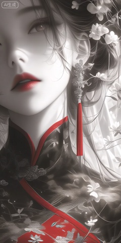 a digital illustration shoot from a portrait camera angle about a close-up portrait of a woman with long, flowing hair adorned with flowers, in a monochromatic and elegant style, the image also shows a woman in the middle of the frame, with her face partially obscured by a veil, wearing a traditional japanese outfit with a red and black cheongsam, adorned with intricate floral patterns and a pair of earrings, the woman has a serene expression and is looking directly at the viewer with her brown eyes, her hair is styled in a long hair with a hairpiece adorned with white flowers, and her lips are painted with red lipstick, the background is a soft, blurred light with floral patterns, and the overall effect is one of elegance and sophistication,
