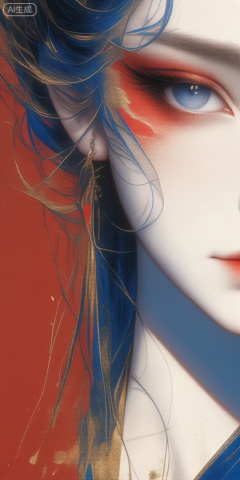 a close-up portrait of a woman with striking makeup, featuring a blend of white and red colors, the woman, positioned in the middle of the image, is facing the viewer with her blue eyes looking directly at the viewer, her hair is styled in a long, flowing manner with blue and gold strands framing her face, she has a serene expression, with her lips slightly parted and her nose slightly upturned, the background is a solid teal color, with subtle splashes of red and gold adding a touch of elegance to the overall composition, the image is highly detailed and realistic, with a focus on the womans facial features and the vibrant colors of her makeup, she is wearing a pair of earrings, which add to her elegant and sophisticated look,