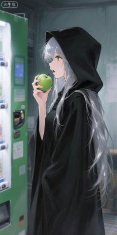a digital illustration shoot from a profile camera angle about a young woman with long, flowing silver hair, wearing a black hooded cloak, holding a green apple in her right hand, standing in a dimly lit room with a green and white vending machine in the background, the image also shows soft, diffused lighting and a blurred background, on the middle of the image, a 1girl, who appears to be in her early twenties, is standing with her upper body facing the viewer, looking to the side with a neutral expression, she has a slim body, long hair, and green eyes, her hair is styled in a long hair style with silver highlights, and she is wearing a dark cloak, she is holding an apple with both hands, and her mouth is slightly open, as if she is about to take a bite,