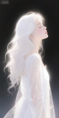 a digital illustration shoot from a profile camera angle about a serene figure of a woman with long, flowing white hair, illuminated by soft light, the image also shows a soft, ethereal glow emanating from her head and shoulders, creating a dreamy atmosphere, on the middle of the image, a young woman appears to be in her early twenties, with her eyes closed and a peaceful expression on her face, she is facing away from the viewer, and her long, wavy white hair cascades down her back, the woman is wearing a white dress that is partially transparent, allowing the soft light to shine through and create a sense of depth and dimension, the background is a dark, gradient black, which contrasts with the womans delicate features, the overall effect is one of serenity and tranquility, with the soft and ethereal lighting adding to the dreamy ambiance,