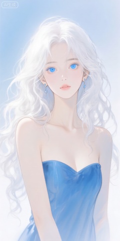 a digital illustration shoot from a portrait camera angle about a portrait of a young woman with long, wavy white hair and striking blue eyes, wearing a blue strapless dress, the image also shows a soft, ethereal light illuminating her face and upper body, on the middle of the image, a 1girl, who appears to be in her early twenties, with light skin and a slender physique, is facing the viewer, looking directly at them with a neutral expression, she has blue eyes and is wearing a strapless blue dress with a plunging neckline that accentuates her bare shoulders, her hair is long and wavy, and her hair color is white, she is wearing earrings and has a delicate, elegant look, the background is a soft gradient of light blue and white, creating a dreamy and ethereal atmosphere,
