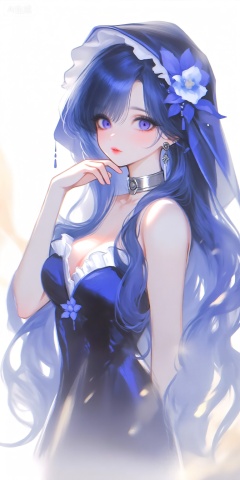 a digital illustration shoot from a portrait camera angle about a portrait of a young woman with long, flowing blue hair wearing a dark blue and white dress with a hood, adorned with a flower, the image also shows a soft, ethereal atmosphere with a focus on the subjects delicate features and elegant attire, on the middle of the image, a 1woman, who appears to be in her early twenties, with a fair complexion and blue eyes, is standing with her hand on her chin, looking directly at the viewer with a serene expression, she has long, wavy, dark blue hair that falls down her back, and her hair is styled in a way that frames her face, her eyes are a deep purple color, and she is wearing a black dress with white ruffles and a plunging neckline, revealing her cleavage, she is also wearing a silver choker and earrings, adding to her elegant and sophisticated look, the background is blurred, with soft, warm lighting that highlights her features and creates a sense of depth and dimension,