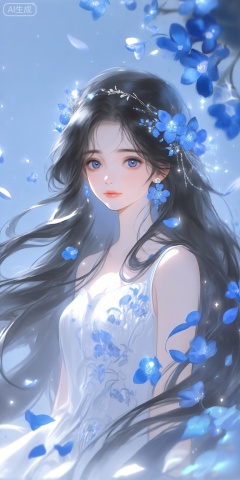 a digital illustration shoot from a portrait camera angle about a beautiful woman with long, flowing black hair adorned with blue flowers and a delicate headpiece, surrounded by sparkling blue petals, the image also shows a serene and ethereal atmosphere, on the middle of the image, a young woman appears to be in her early twenties, with a calm and gentle expression, looking directly at the viewer, she has blue eyes and is wearing a white, sleeveless dress with intricate floral patterns, her hair is long and flowing, and she has a delicate, ethereal appearance, she is surrounded by a soft, glowing blue background with floating petals, giving the image a dreamy and magical feel,